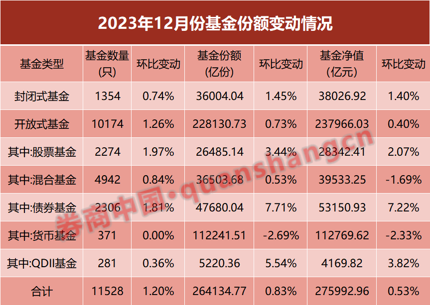2023年12月,上证指数下跌1.81%,深指下跌超2%。而震荡市中,净值更为稳健的债券基金依旧延续年内火热的态势,单月份额增长超过3400亿份,规模也增加了3580.67亿元。